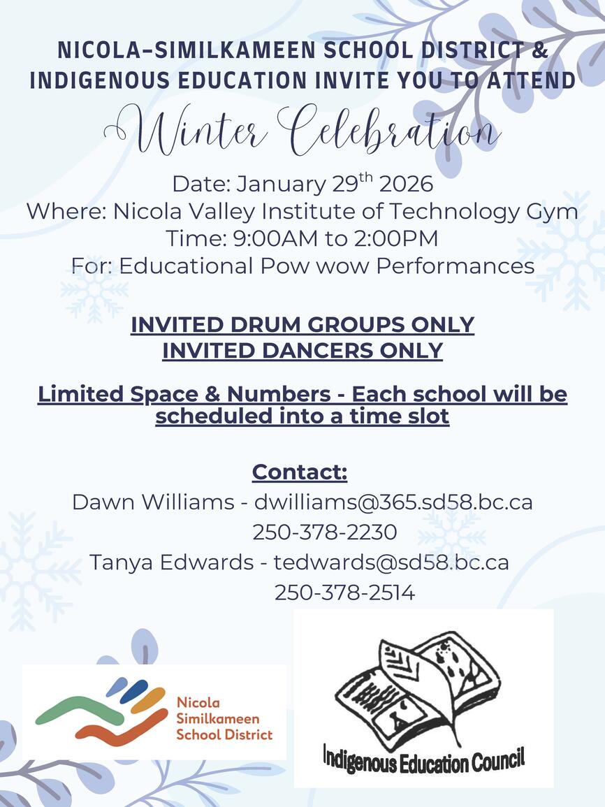 Breadcrumb Home Announcements announcement Nicola-Similkameen Winter Celebration Posted: November 26, 2025 - 8:31am Expires: January 31, 2026 - 8:36am Announcements Nicola-Similkameen Winter Celebration News Stories Winter Concerts & Events Around the District Digital Resources for Parents Embracing Change - Youth Conference Our Calendar Last Day of school before Winter Break Dec 19 Winter Break Dec 22 - Jan 2 Ribbon Skirt Day Jan 4